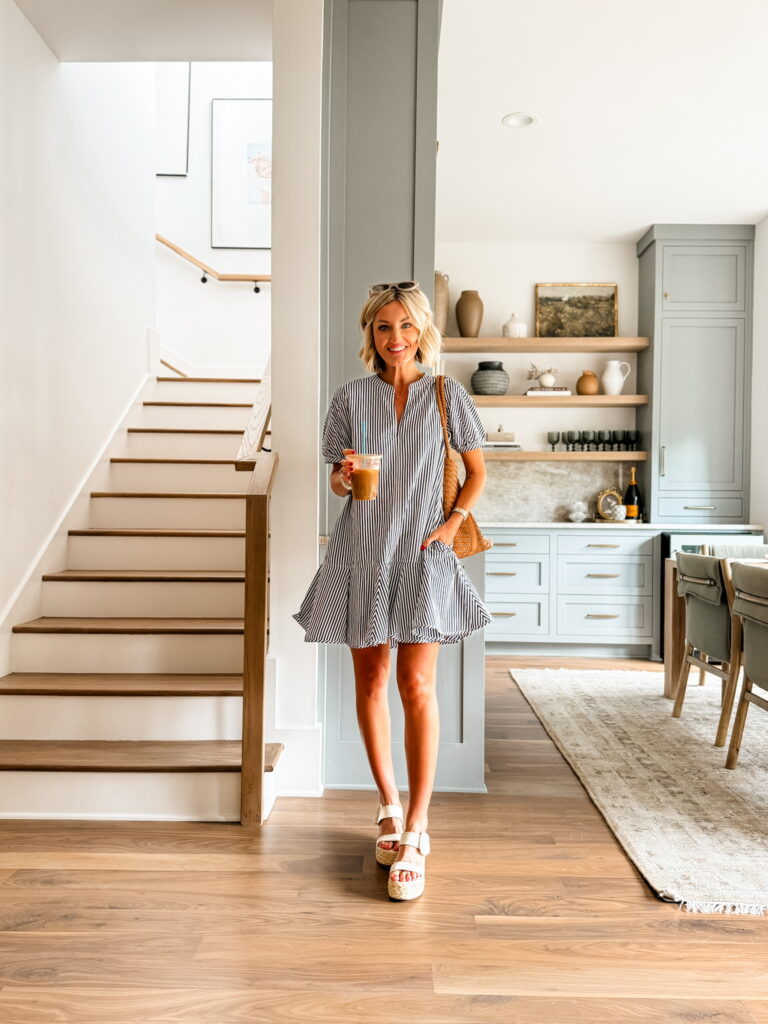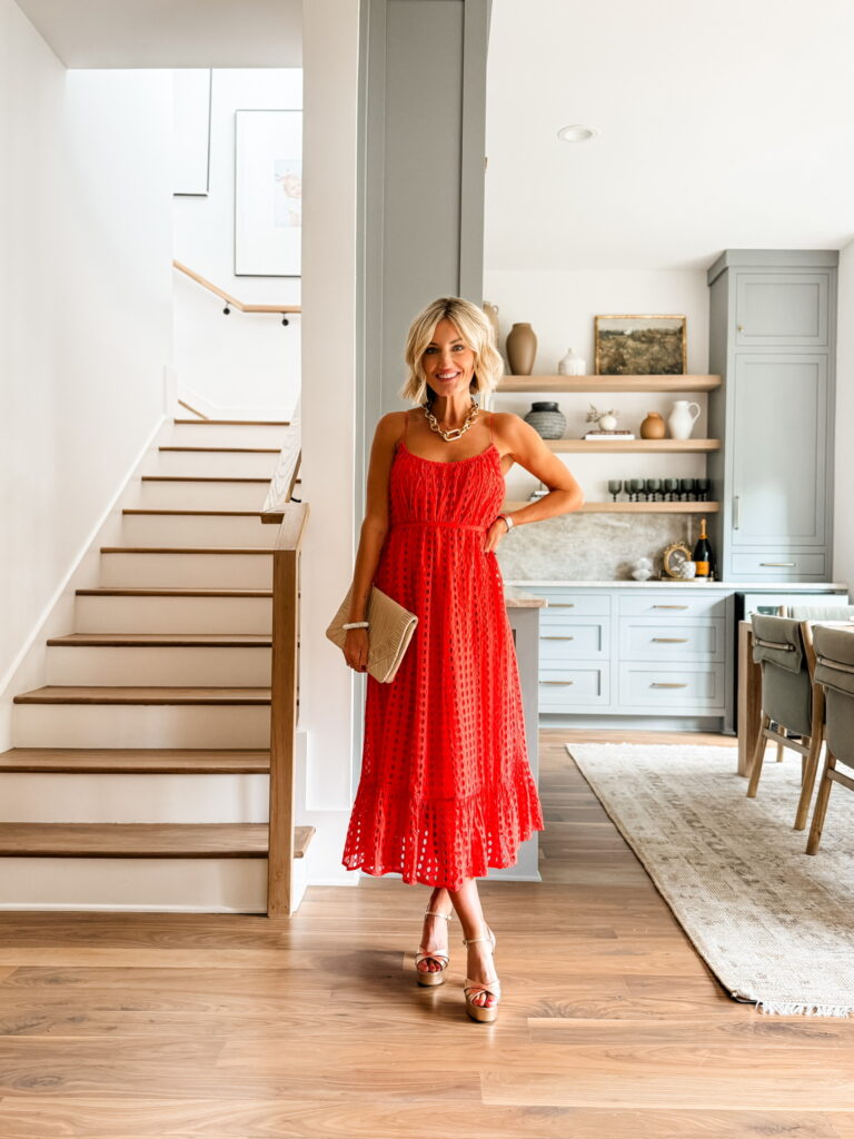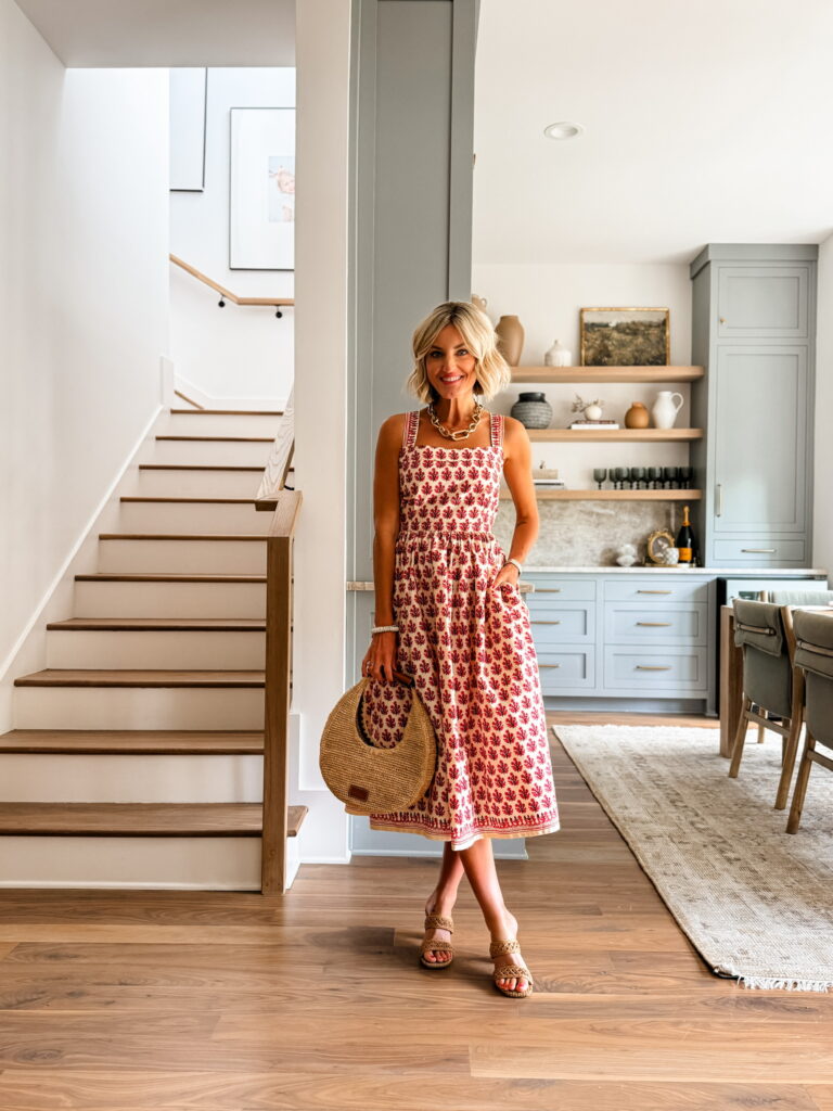 The next set of dresses is just as cute. First up, this red eyelet maxi dress is just darling, especially perfect for the 4th of July or any festive summer occasion. I styled it with platform heels and a simple clutch. The second dress is a cotton poplin beauty that’s as versatile as it is comfortable. Whether you’re running errands, brunching with friends, or heading out for a casual shopping day, it’s an easy go-to. I paired it with platform wedges and a woven tote for a relaxed yet put-together outfit.