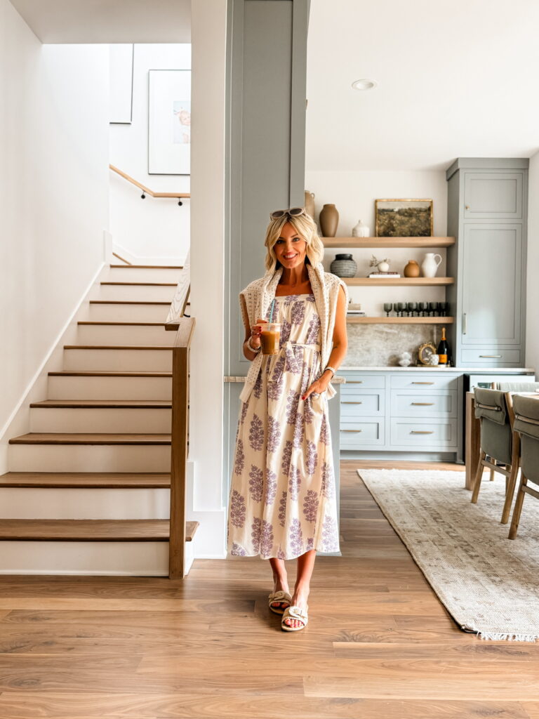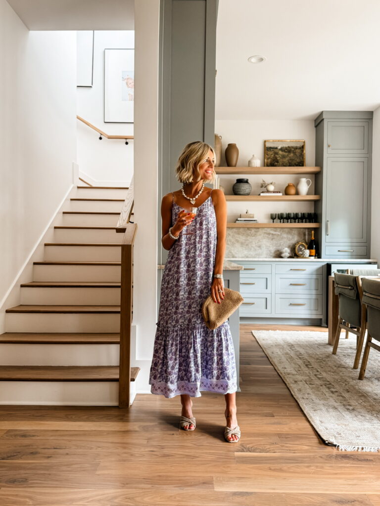 These next two dresses are absolute must-haves for a summer beach vacation! The first is a light and airy cotton dress featuring a charming floral block print. I styled it with rattan sandals and a sweater draped over the shoulders for an easy, layered look perfect for seaside dinners or sunset strolls. The second dress stuns in a gorgeous periwinkle hue, adorned with a delicate floral pattern that feels both fresh and feminine. I paired it with classic wedges and a rattan clutch to complete a polished, vacation-ready outfit.