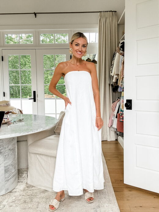 I styled it here with tan boots and a neutral quilted bag that elevates the look but is still practical. This would be a gorgeous option for fall that also work for family photos, Thanksgiving celebrations, or even date night. Bonus: it’s bump-friendly, which makes it even more versatile.