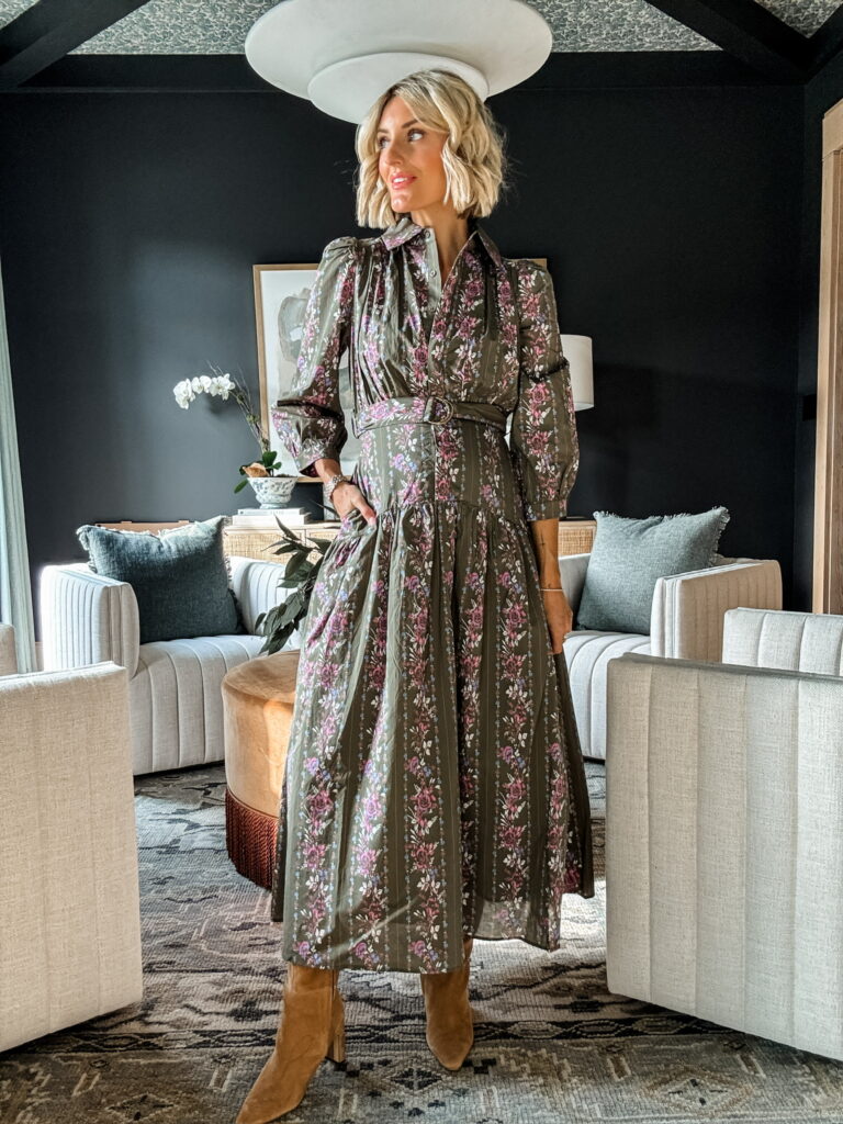 The print on this midi dress immediately caught my eye—it’s feminine, timeless, and works beautifully for the season. It’s fully lined, has pockets, and the long sleeves with a collared neckline make it feel polished. The removable belt is adjustable, but I recommend sizing up if you’re between sizes or expecting since the button-front detail is a little more fitted through the midsection.