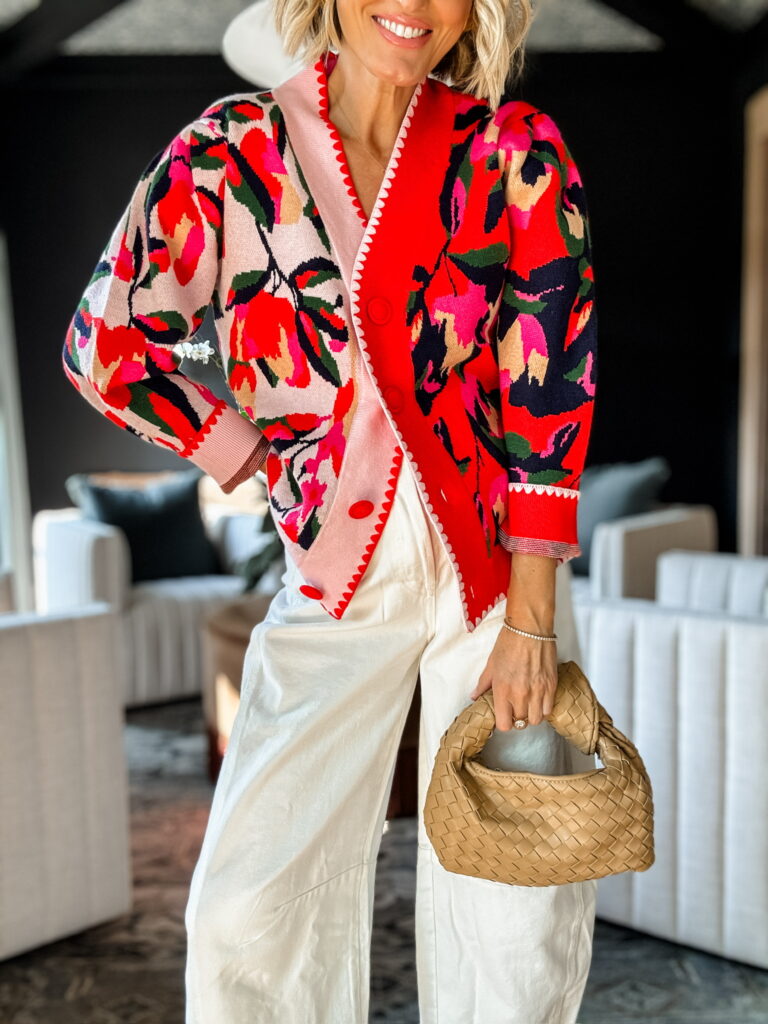 If you’re a color lover, this cardigan is the piece you need this season. I was immediately drawn to the unique two-tone design. A friend who leans toward brighter, bolder outfits loved this sweater when she saw it at my house, and I think it’s such a conversation starter.