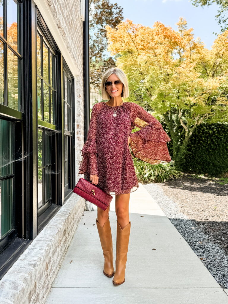 This dress is made for occasions when you want to look like you put in effort without overthinking it. The bell sleeves and warm floral print make a statement on their own, so you don’t need much else. Neutral boots are the perfect choice, they let the dress shine while still anchoring the look. Add a blazer to take the look from sweet to sophisticated.