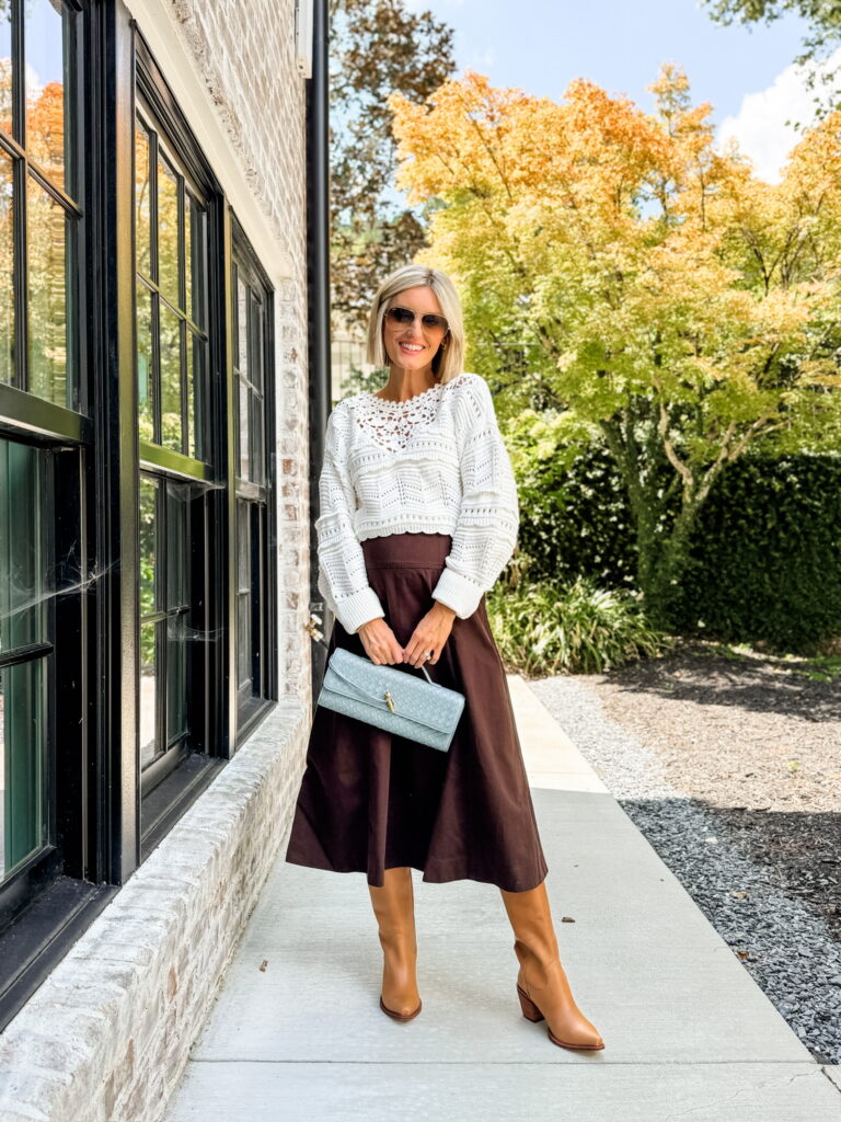 A shorter sweater paired with a longer skirt creates just the right amount of contrast. The white knit keeps the look light, while the chocolate midi skirt adds depth and warmth. Tucking just the front of the sweater defines your waist, and tan boots keep everything balanced. It’s cozy but still pulled together, which makes it perfect for the season.