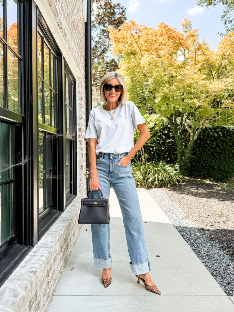 Sometimes the most basic pieces are the ones you wear the most. A gray tee with cuffed denim is effortless, but when you add leopard heels and a structured black bag, it instantly feels styled. Layering on a couple of necklaces is another easy way to make this outfit look more finished. It’s an everyday go-to that you’ll reach for on repeat.