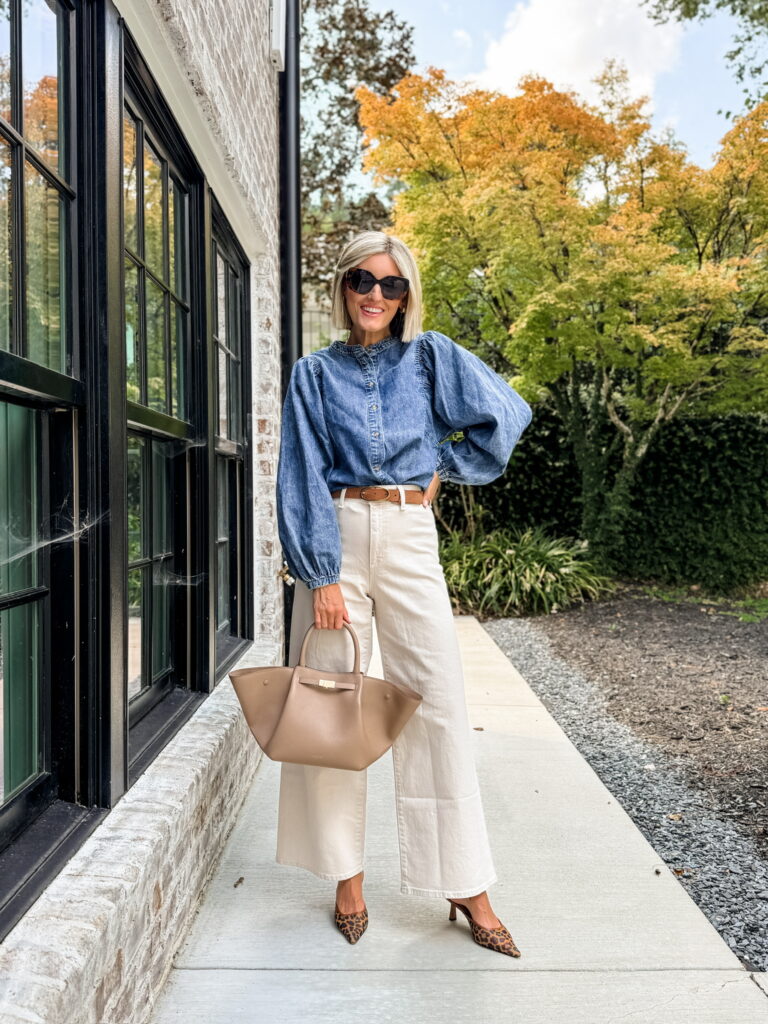 Wide-leg pants are such a good option for fall, especially in a creamy neutral that feels fresh. Tucking in a denim blouse gives shape at the waist and keeps the proportions right. The pointed-toe leopard heels make the legs look even longer, while a soft tan bag pulls everything together. It’s a simple recipe that always feels current.
