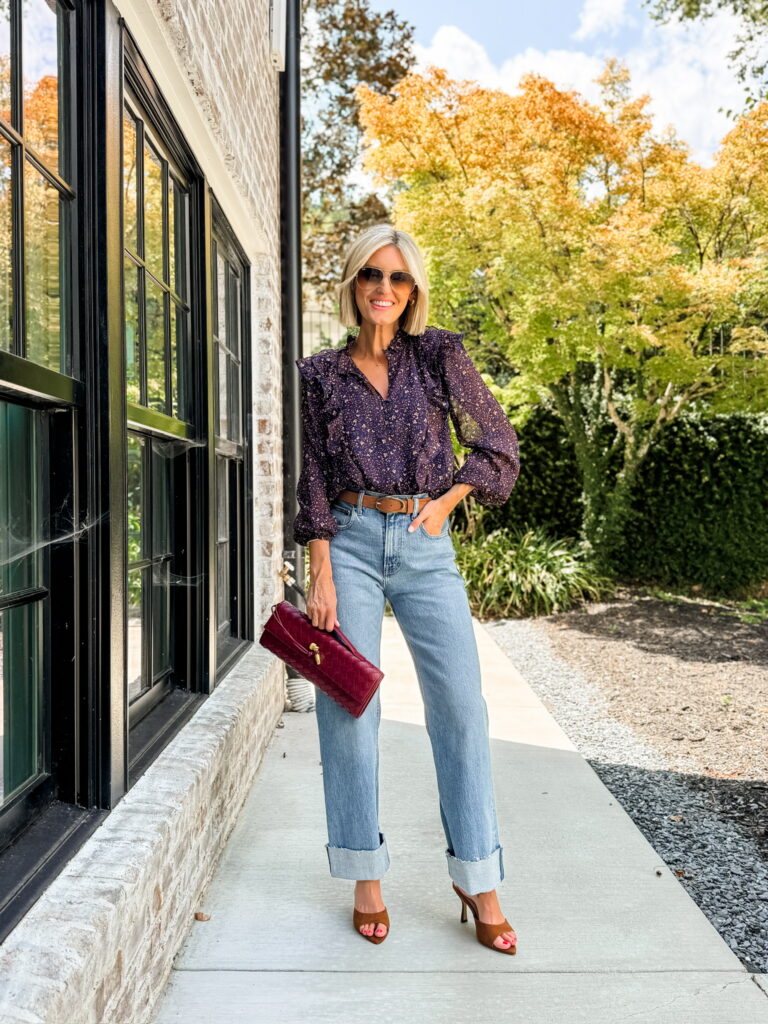 A ruffled blouse like this one does all the heavy lifting in an outfit. You don’t need much else, just classic denim and a bag in a rich, seasonal tone. Burgundy is a great choice because it complements the darker floral print without being too matchy. This outfit is proof that one statement piece can carry your whole look.