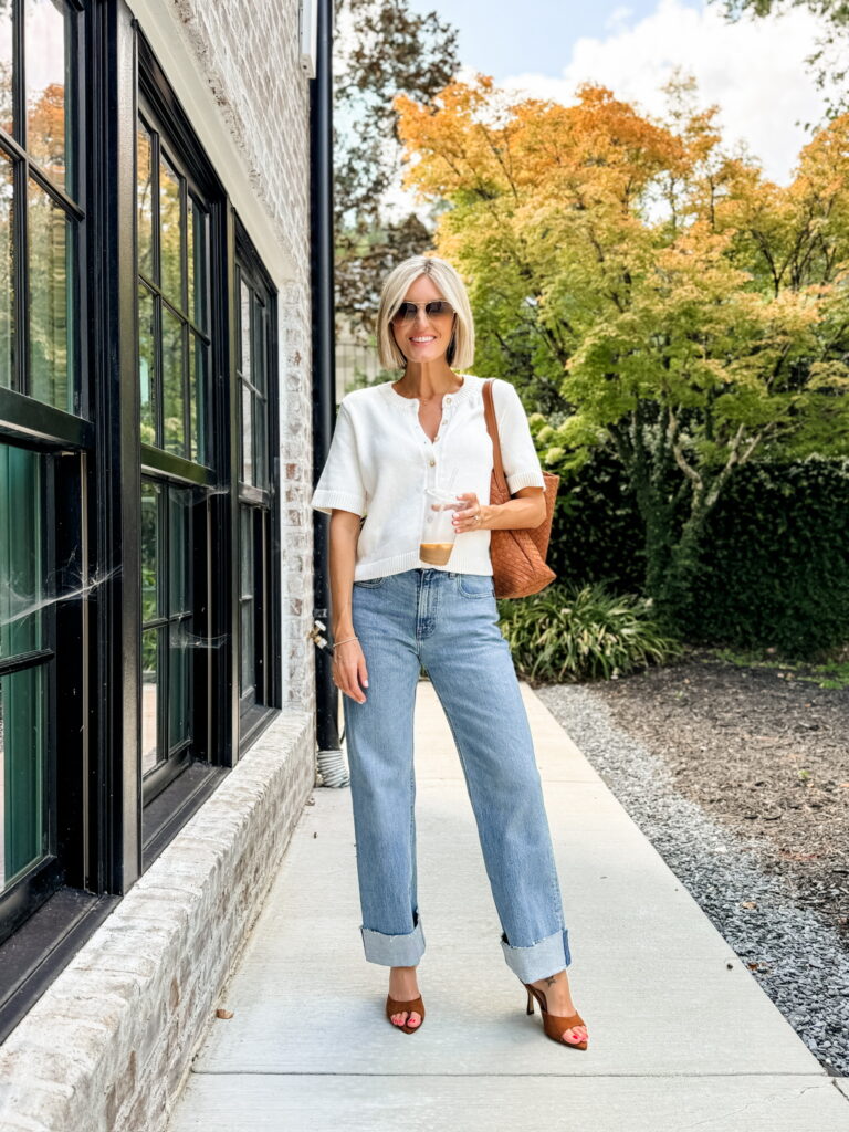 This combo is such a fresh take on everyday denim. The cropped knit top pairs perfectly with cuffed jeans, creating balance that feels intentional without trying too hard. A neutral heel gives just enough height, and the woven tote adds the kind of texture that always works in the fall. Rolling your denim like this also draws attention to your shoes, so it’s a fun way to show off a favorite pair.