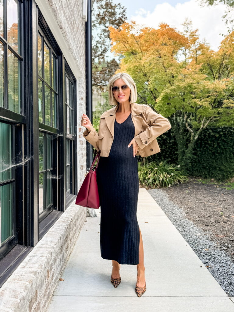 A ribbed sweater dress is always a win for fall because it’s simple, flattering, and easy to layer. Adding a cropped trench brings structure, which keeps the outfit from feeling too relaxed. The leopard heels are the little detail that makes the whole look memorable, and a burgundy tote ties it into the season. This is the kind of outfit that looks like you planned ahead, even if it only took five minutes.