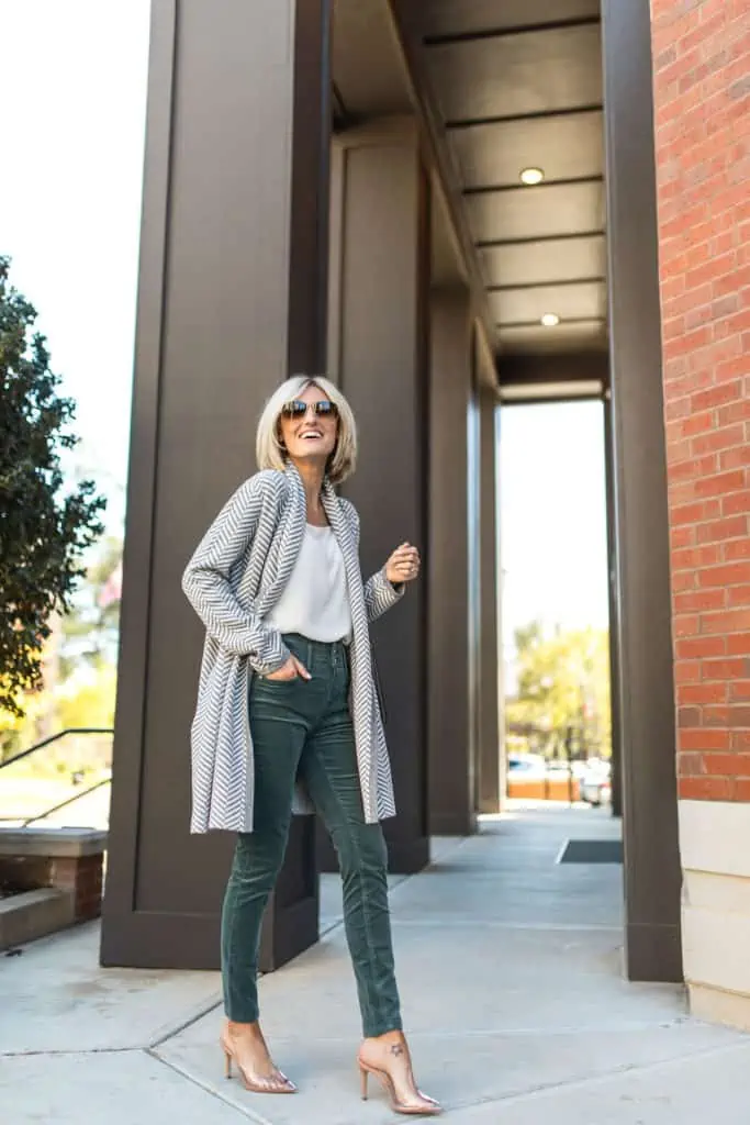 Next up is a more casual look from Ann Taylor. This herringbone cardigan has been a new favorite. Whether I’m lounging at home or out running errands, it’s been so easy to pair with casual outfits. I really like that it’s a little longer in the back. It could easily be dressed up with a dress to wear to work. I’m wearing XS and say it’s true to size.