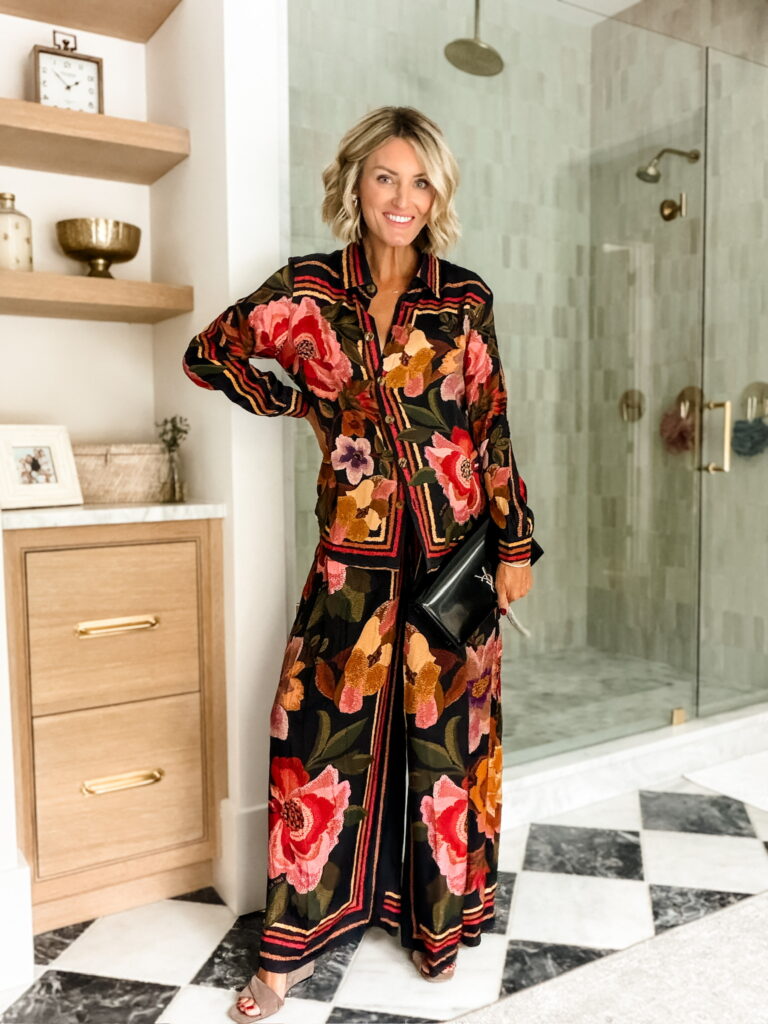 A matching set is one of my favorite fashion hacks! Not only does it make for a perfectly coordinated outfit, but the pieces can also be mixed and matched to create entirely new looks. This floral chenille set from Anthropologie is truly stunning and ideal for dinner and drinks with the girls. I styled the full set with wedges and a clutch for a polished evening look, then repurposed the top with dark denim and leopard-print kitten heels for a more casual vibe.