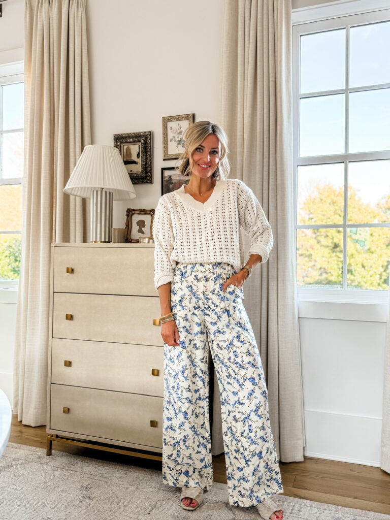 This last look is such a fun one. These floral linen pants are so adorable and would you believe they are from Target?? I paired them with a crochet sweater and flats for a cute but comfortable look. I finished this look with these ruffle kitten heels to dress this look up a little more. This would be great for brunch with friends or a baby shower. Styling with lightweight materials allows you to keep the silhouettes you love while still adapting to the weather!
