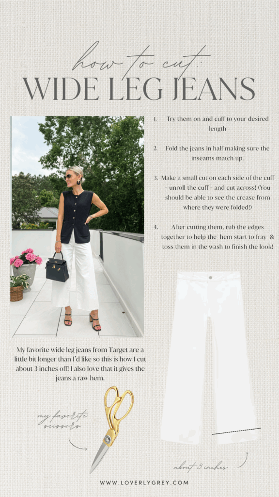 Hi friends! I’ve got a fun and crafty blog post for you today. Who doesn’t love a good DIY, especially one that adds a stylish, personalized touch to your wardrobe? Today, I’m showing you my favorite way to cut wide-leg jeans for that perfectly cropped look. I recently snagged a pair of jeans from Target that were just a bit too long, so I decided to give them a quick DIY hem. I’ll walk you through my simple, tried-and-true steps to get that effortless raw hem without ruining your jeans!