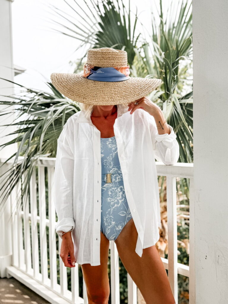 One of my favorite things about a linen button-down is that it can also be worn as a swim cover-up! Toss it over your favorite suit for that effortlessly chic, vacation-ready look. I love pairing this with a straw hat for the beach look.