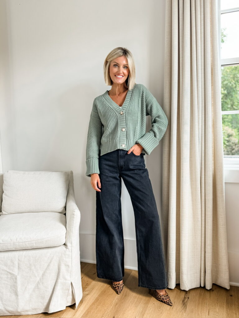 To wrap things up, I wanted to share a few looks that are perfect as we start transitioning into cooler weather. First is this cozy ribbed sweater from Loft, a timeless closet staple that can be dressed up for the office or styled more casually like I did here with black jeans and sneakers. Next is a sage green cotton-blend sweater from Abercrombie. I’m obsessed with the textured fabric, it adds such a nice touch. I kept it simple by pairing it with the same black jeans and cheetah print kitten heels. And last but not least, this cropped trench coat (also from Abercrombie) is such a great piece as we head into fall. I styled it with a white bodysuit, relaxed high-rise jeans, and those same kitten heels for a polished, transitional look.