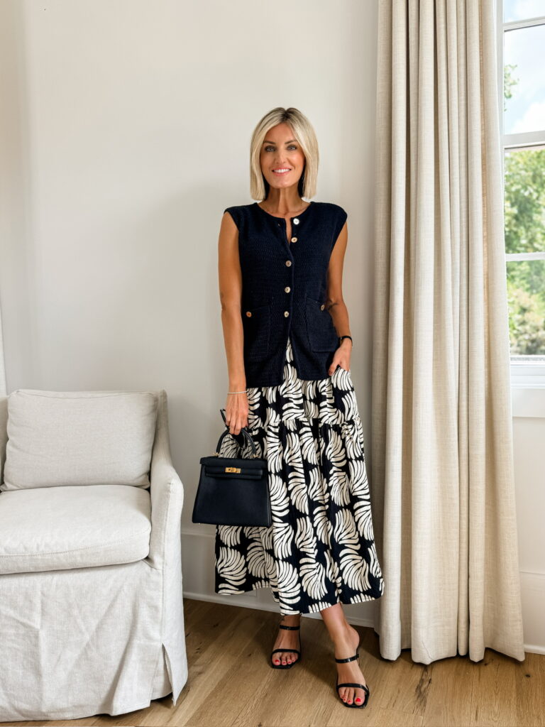 This gorgeous black vest looks so luxe, but it’s actually an affordable Amazon find! It’s incredibly versatile, perfect for the office or out and about on the weekends. I styled it two ways to show just how easily it can be dressed up or down. For a more casual vibe, I paired it with white shorts and cheetah print kitten heels. For a more elevated look, I swapped in a patterned maxi skirt and black heels. Two different moods, one fabulous piece!