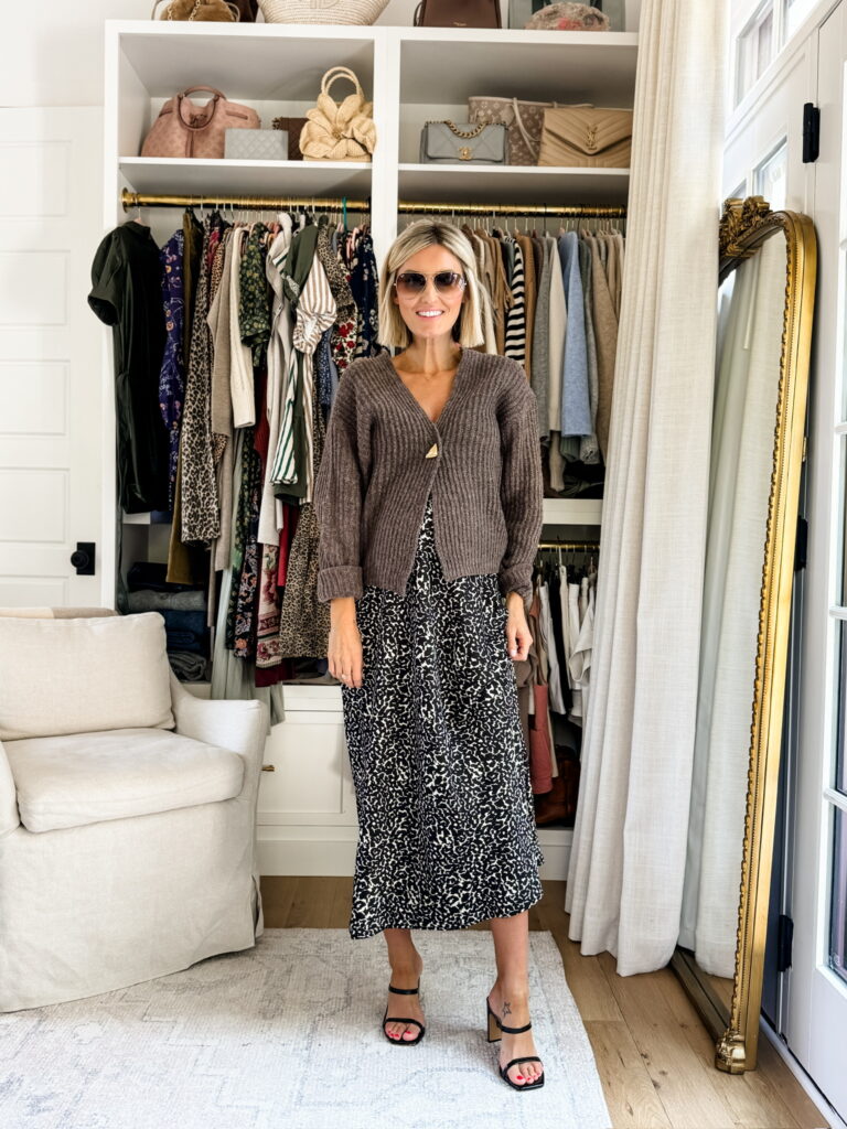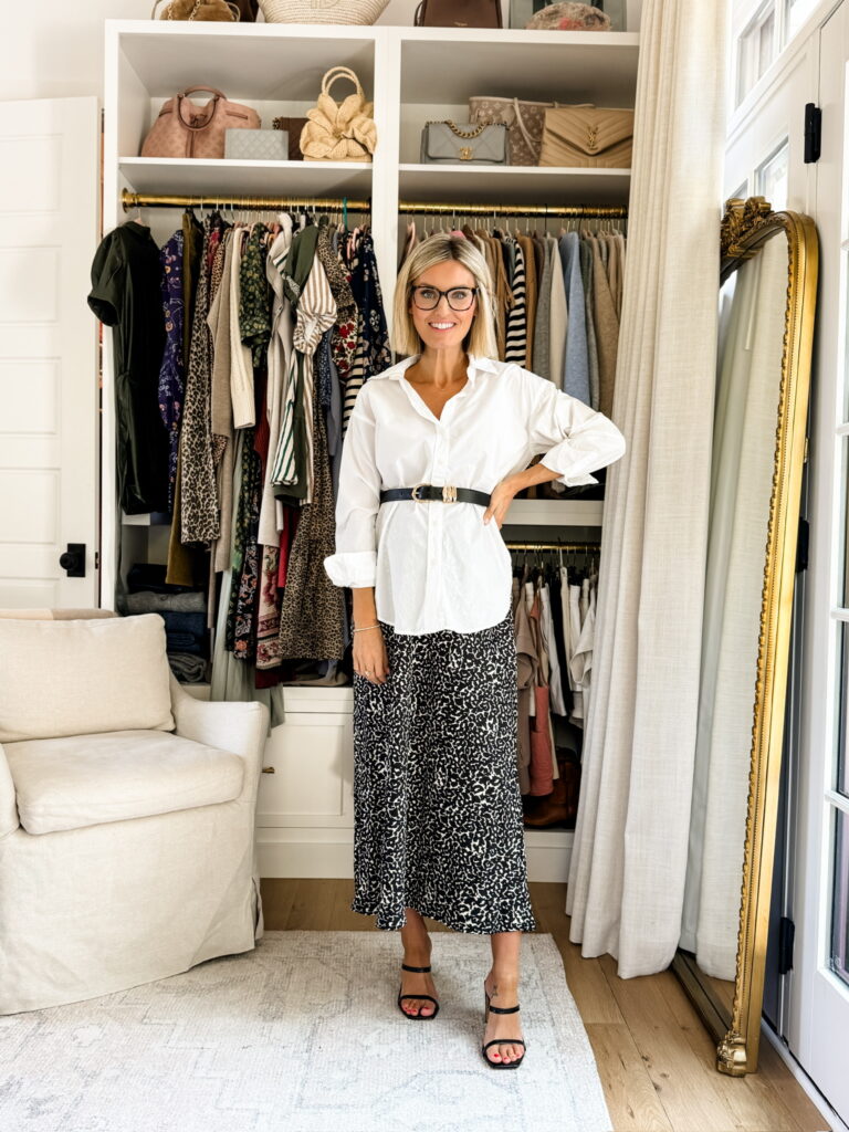 You guys won’t believe where this next dress is from—it’s just $34 from Walmart! Such a steal for a stunning skirt dress. Because the dress makes such a statement on its own, I kept the accessories simple. I also love styling maxi skirts in the fall, this cream leopard one from Target is so elegant. Paired with a white button-up and a belt, it’s a versatile look you can wear to the office and then straight to a nice dinner.