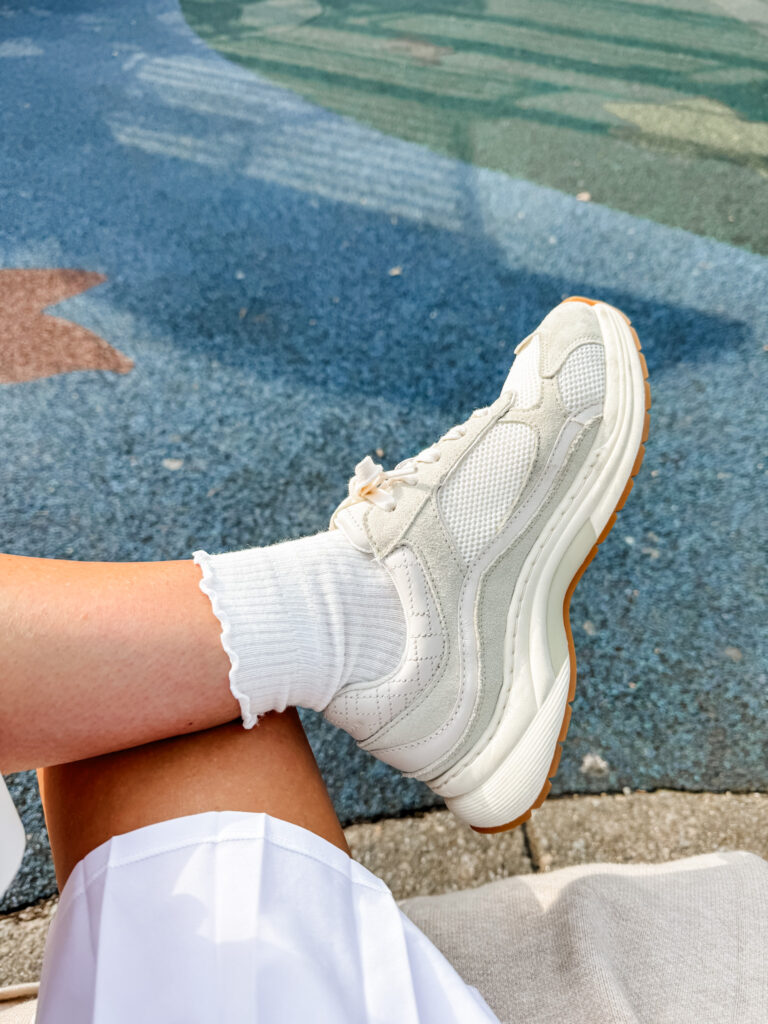 These frilly socks have been such a fun addition to my wardrobe lately! I found a great pack on Amazon for a very low price. I’ve been wearing them mostly with athleisure, and I love the way they look—just a cute little detail that adds something extra. Also, these sneakers have been a favorite—they’re super comfortable and right on trend. The sage green color is so good too!