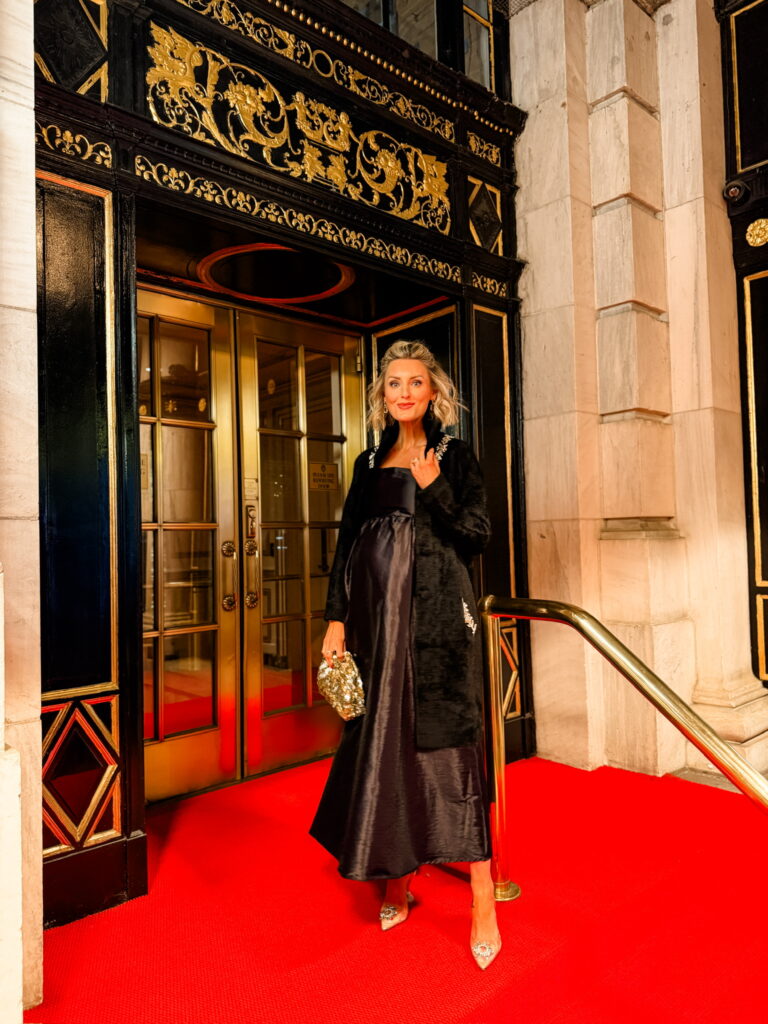 This is the look I wore to the Walmart Holiday Preview event at The Plaza Hotel. The black dress is from Walmart, bump-friendly, and so beautiful for the holidays. I had so many people ask about it. Fit is true to size, and I’m wearing the XS.