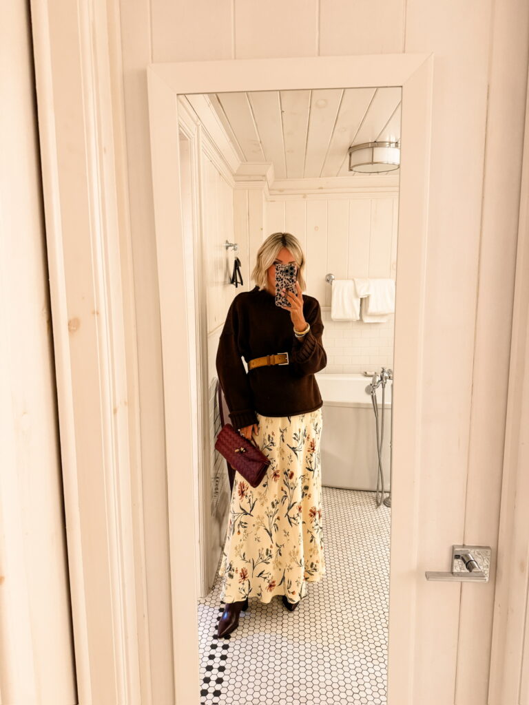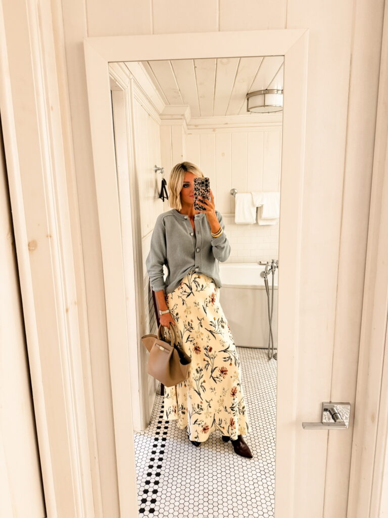 Hi friends! For today’s blog post, I wanted to show you how investing in one solid staple piece is so worth it for the number of outfits you can create. The star of the show in all the looks I’m sharing today is a stunning floral A-line maxi slip skirt from Anthropologie. It’s the perfect foundation for countless fall outfits. Let’s dive into the different ways to wear it this season!