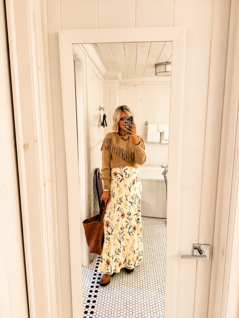 I couldn’t resist styling a few more sweater looks, because this skirt truly is the epitome of autumn fashion! First up, the J.Crew roller neck sweater pairs beautifully with the skirt, especially when styled with a suede belt, boots, and a maroon clutch. And for a western-inspired twist, I love this fringe sweater from LOFT—so fun with western booties and a suede tote.