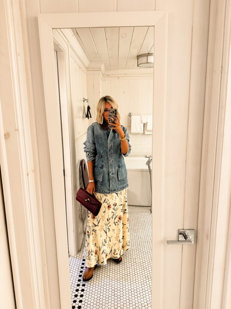 To kick things off, I’ve gathered a collection of looks where I styled the skirt with some classy statement jackets. The first is a relaxed herringbone blazer that complements the floral print beautifully. Paired with suede heels and a maroon clutch, it’s a look that works just as well for an evening out as it does in the office. The second features a chic flight zip jacket—a more laid-back option than the blazer, but just as stylish when worn with rancher boots and a suede tote. And last but not least, I couldn’t resist pairing the skirt with J. Crew’s classic barn jacket. It adds the perfect touch of fall layering and creates a timeless look you’ll want to repeat all season long.