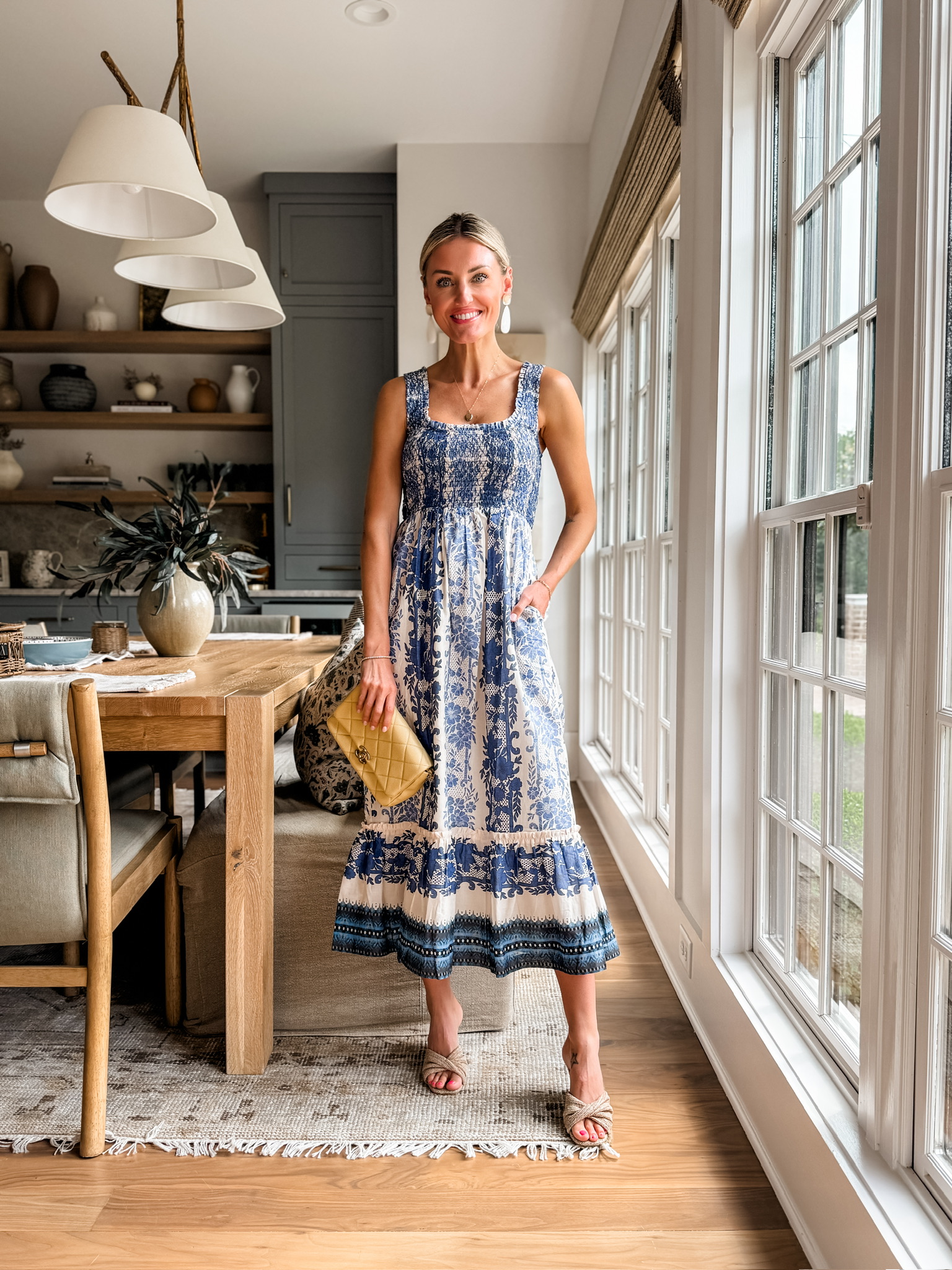 This blue and white printed midi is the definition of springtime ease. The smocked top makes it incredibly comfortable, while the breezy skirt moves with you, ideal for garden parties, brunch with friends, or a day exploring your favorite small town. Pair it with strappy sandals and a clutch for a polished look that still feels relaxed.