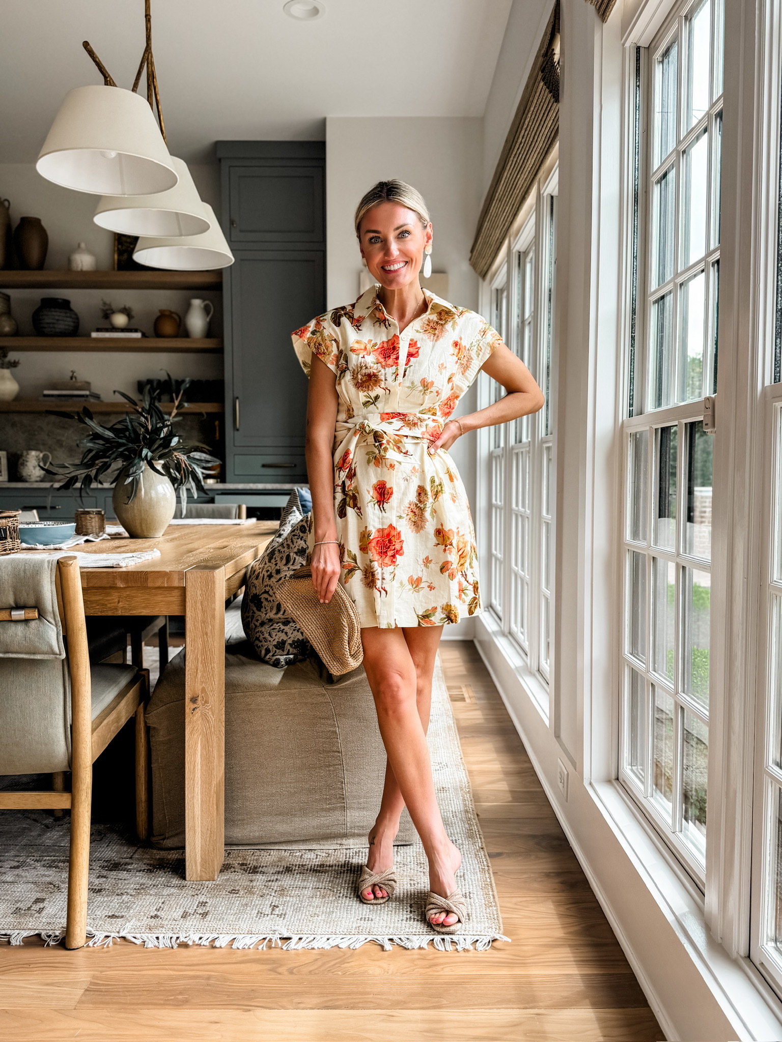 Flirty, feminine, and full of charm, this ruffled floral mini was made for warmer days. I love the cinched waist and flowy sleeves, which make it flattering and easy to wear. It’s the perfect pick for a casual date night or a sunny day of outdoor dining. Bonus points for how cute it looks with a straw bag and neutral slides!