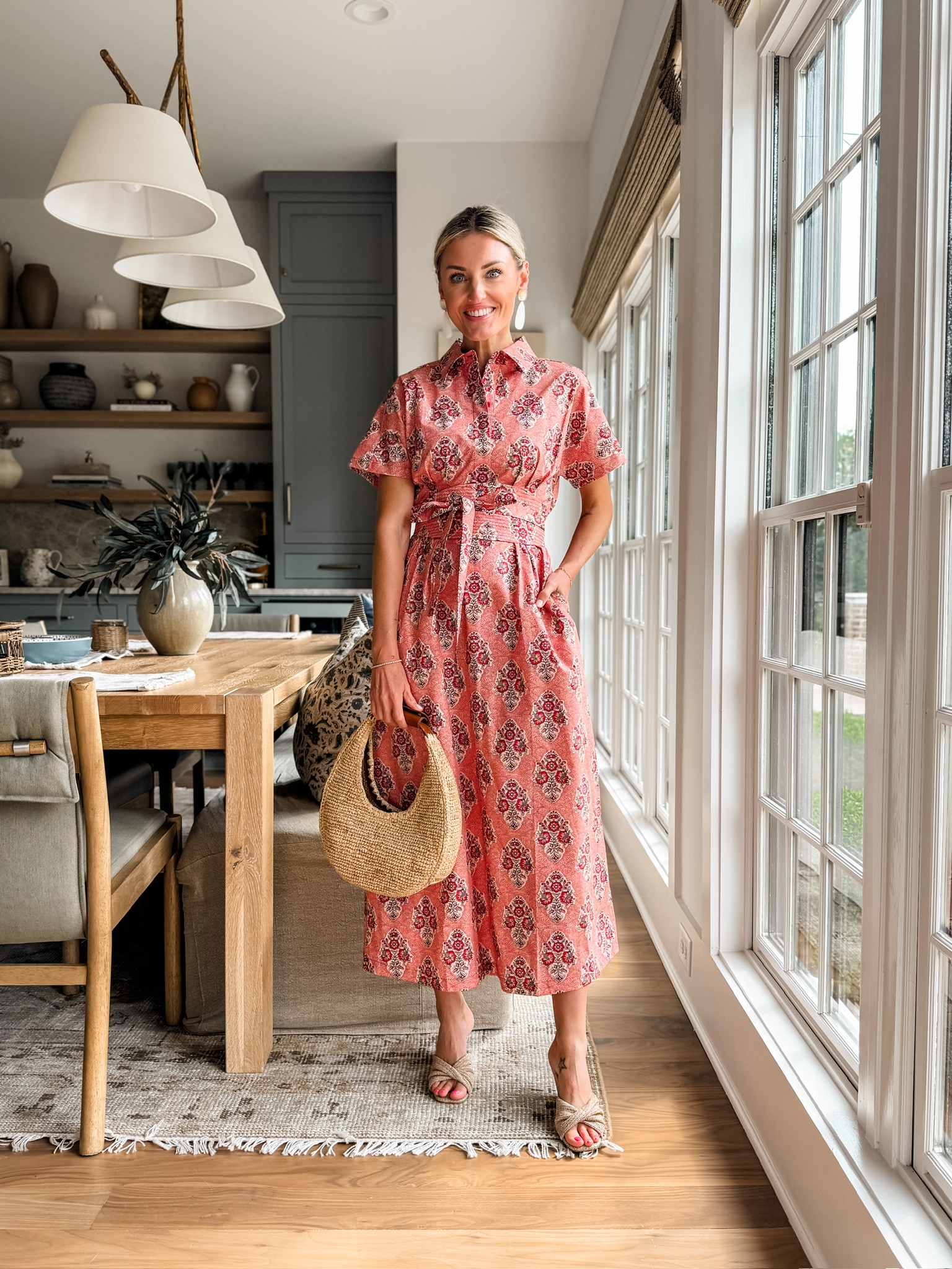 The print on this coral midi is absolutely beautiful up close, and the fabric feels just as luxe. It has an effortless drape and a flattering cut, making it a go-to for showers, vacations, or even a dinner out on vacation. I love how well it pairs with woven accessories and barely-there heels.
