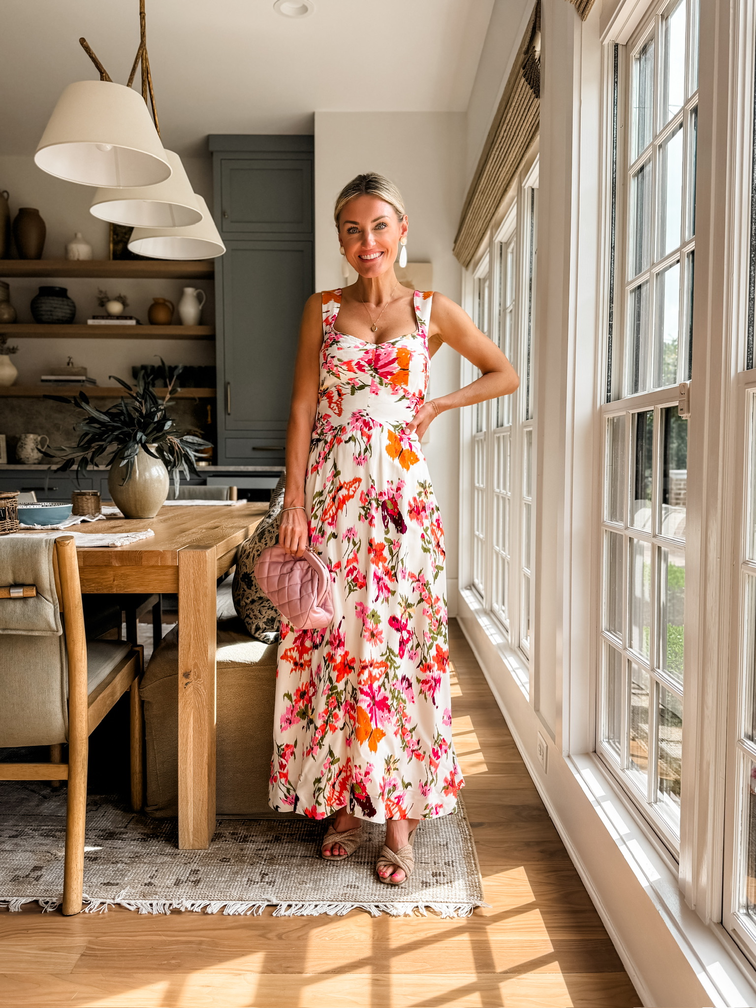 This maxi dress is spring in bright, joyful, and effortlessly romantic. The vibrant pink and orange floral print pops against the creamy background, and the fit is as flattering as it gets. Wear it to weddings, beach dinners, or even just for twirling in the backyard at golden hour.