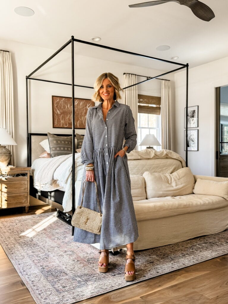 A gingham dress is always a good idea for spring, and this long-sleeve version has been a favorite. It’s lightweight but has enough coverage for those cooler mornings. I dressed it up with brown wedges and my YSL handbag for a polished look. For something more casual, I swapped the wedges for white flats and layered a brown sweater on top. I added a purse from the Loverly Grey x Anthro collection to finish the look. This combo is great for a relaxed weekend or a coffee run when you want to feel put together without trying too hard.