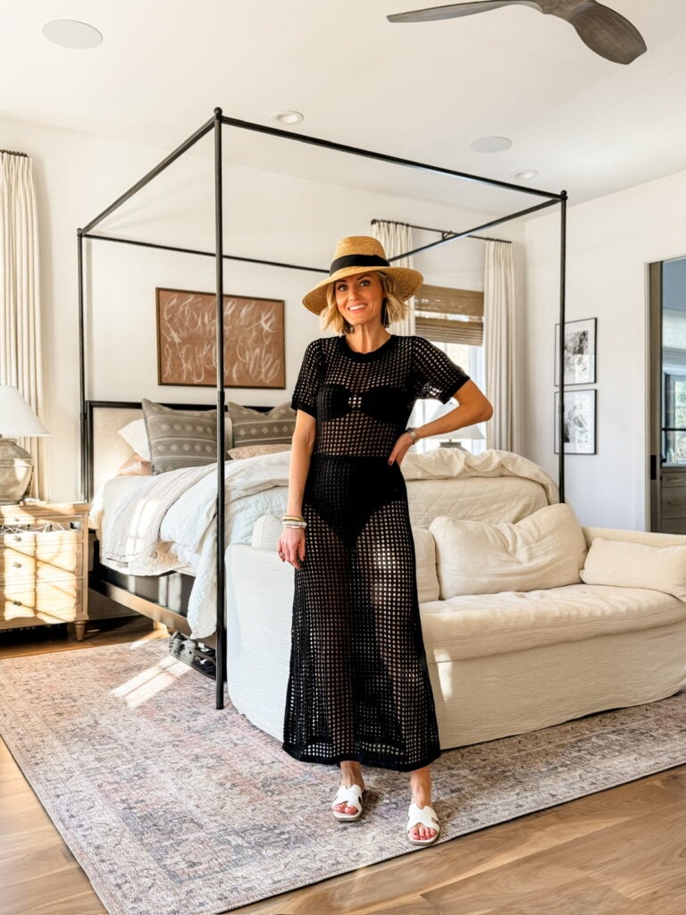 If you have a beach trip coming up or just want a good swimsuit coverup, this option is a great choice. It’s flowy, lightweight, and easy to throw on over a swimsuit. I styled it with white sandals and a beach hat—simple but put together for a day in the sun.