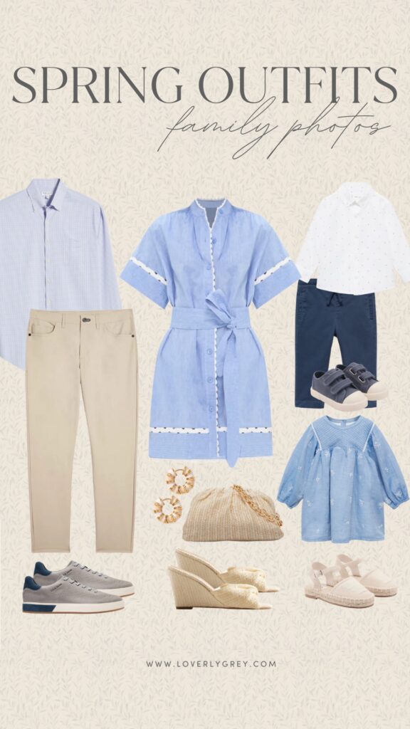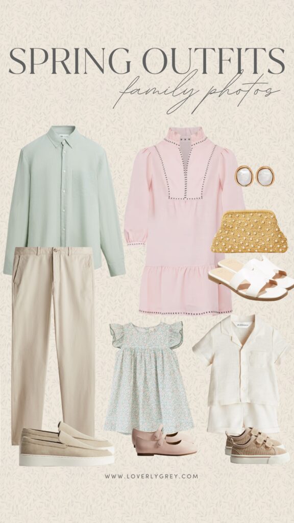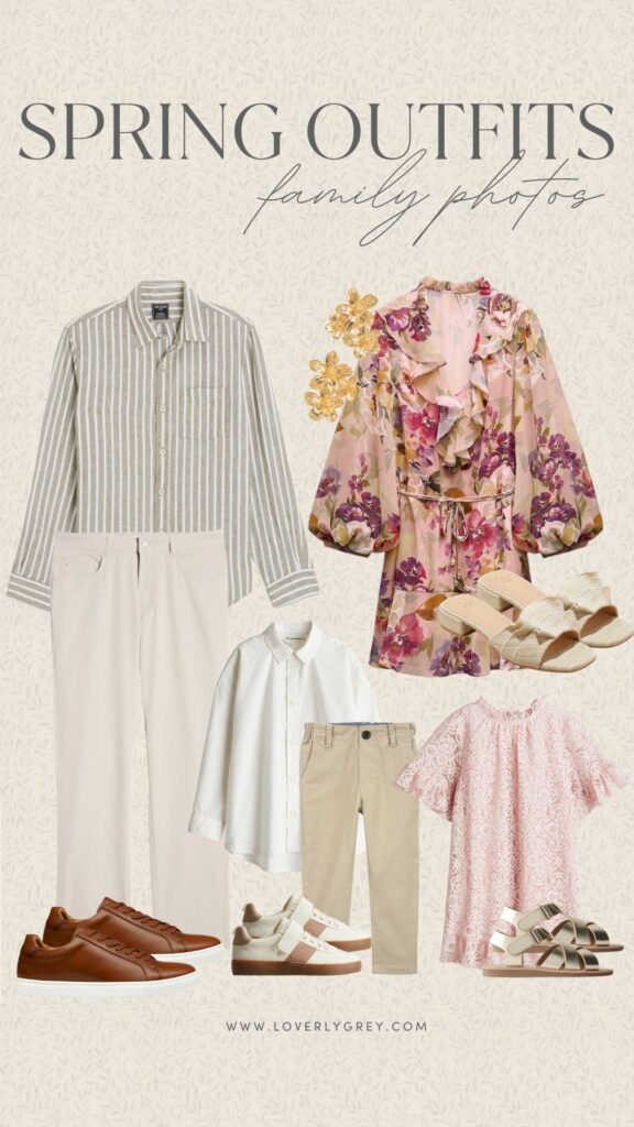 This collection of outfits offers another take on highlighting pink and green hues but adds warm beige tones for a well-balanced look. Dad’s outfit stays classic with a green button-up and khaki pants, and bringing in these dark brown Cole Haan sneakers sharpens up the look. For Mom, this floral pink dress from Hill House is so classy and perfect for springtime photos. As for the little ones, I kept their looks soft and neutral—your little girl will look darling in a light beige linen dress, while your little boy stays sharp in a crisp white and grey striped button-down and khaki pants.SHOP THE OUTFITS