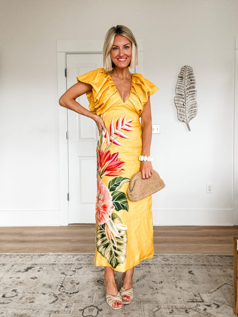 This dress honestly speaks for itself—how stunning is this print?! The bold, tropical floral pattern is so eye-catching, and the vibrant yellow base makes it pop even more. I love the flattering v-neckline and soft ruffle sleeves that give it a flirty, feminine shape. It’s the kind of piece you pack for vacation and also wear out for a springtime date night. No-fuss, just throw it on and go.