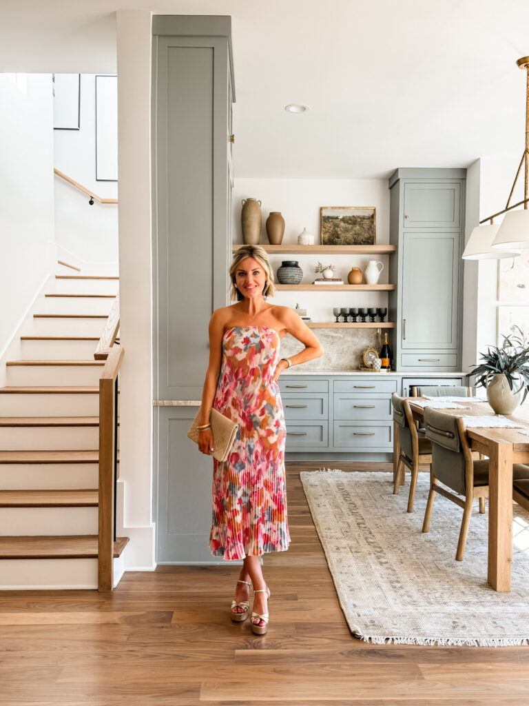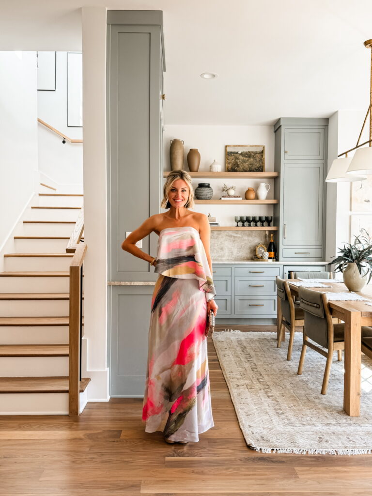 This dress is another stunning choice for a spring or summer wedding! The vibrant pink hue and abstract pattern make it a true statement piece, while the flowy fabric adds a touch of elegance—ideal for a breezy beachfront celebration. To complete the look, I paired it with clear-strap heels and a coordinating pink clutch to tie the whole look together.