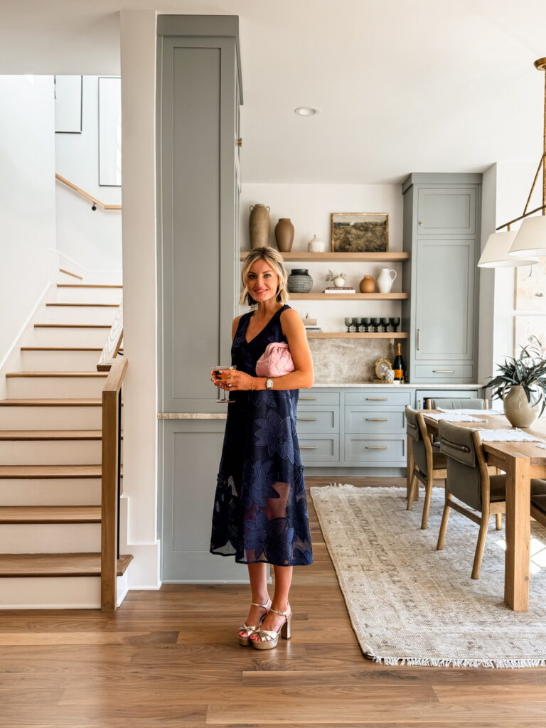 Navy is a timeless and elegant choice for a wedding guest look! This sundress from Tuckernuck is a standout with its flattering silhouette and delicate sheer embroidered lace overlay. To complete the outfit, I paired it with these metallic heels from ShopBop and a charming pink clutch for a subtle pop of color. It’s a simple yet sophisticated outfit that’s perfect for celebrating in style!