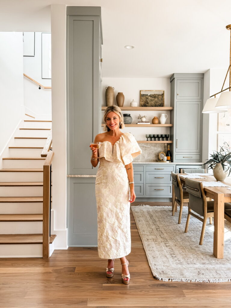 For my final look, I had to include an option for all the 2025 brides-to-be! This dreamy maxi dress is a stunning choice for a rehearsal dinner. The sheer hem, adorned with delicate 3D embroidered flowers, adds the perfect romantic touch. The silhouette is elegant, making it a timeless piece you’ll feel amazing in as you celebrate your upcoming big day. Pair it with simple heels and dainty jewelry for a beautifully polished look!