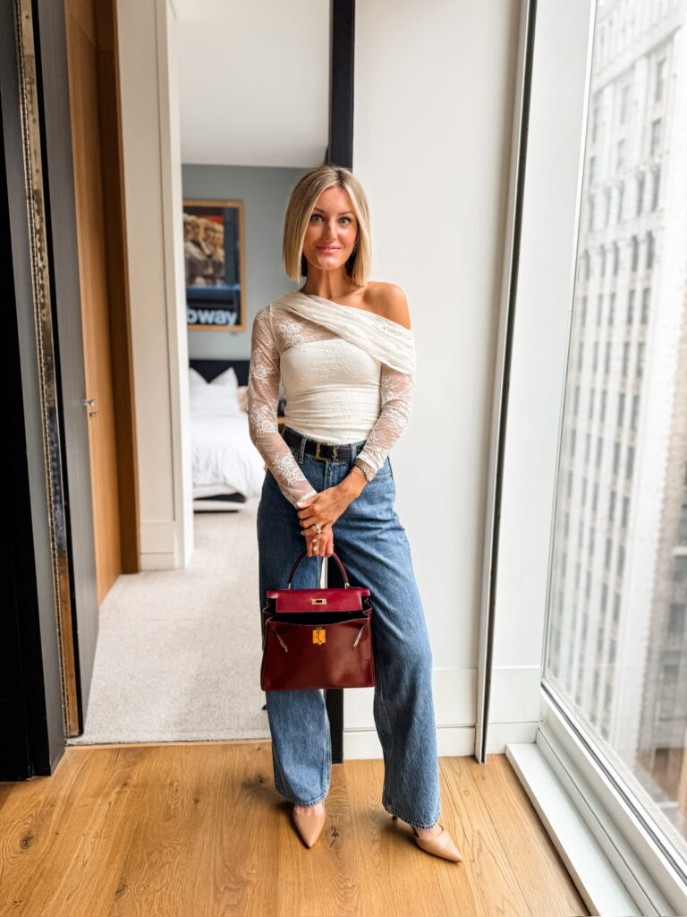 For a stylish yet relaxed daytime look, I paired this fitted one-shoulder lace top with loose, high-rise jeans. The contrast between the delicate lace and structured denim creates the perfect balance of edgy and feminine. A designer belt adds extra texture and definition, while classic, low nude heels elongate the legs for a polished touch.