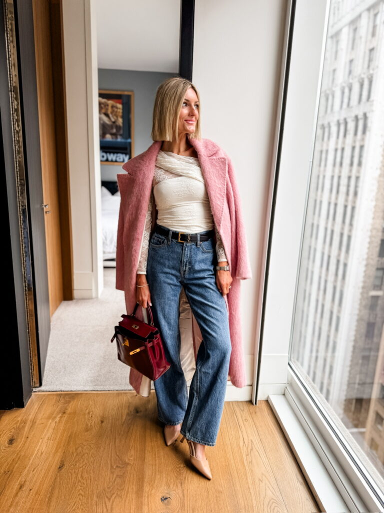 To bring in a pop of color, I opted for a burgundy purse that is a vintage find of mine from Paris! And since spring temperatures can still be unpredictable, I layered on a fun pink coat for warmth. This is an easy, layered look that works for brunch, coffee dates, or a day out in the city! This exact pink coat has limited sizing but I will link similar styles below!