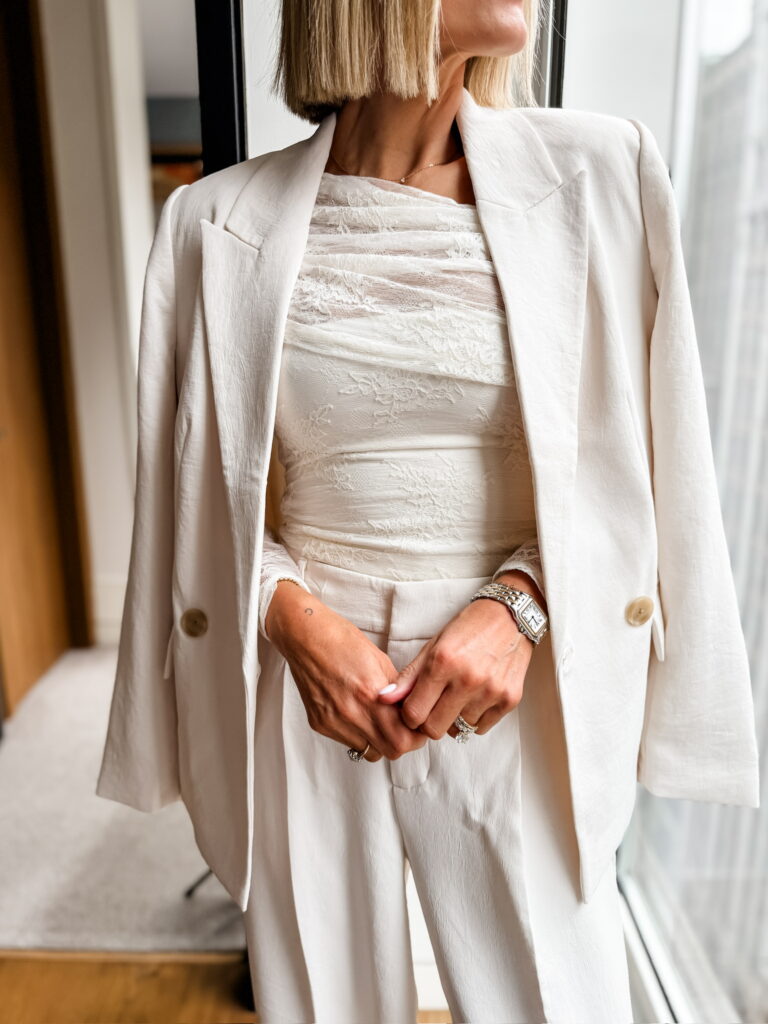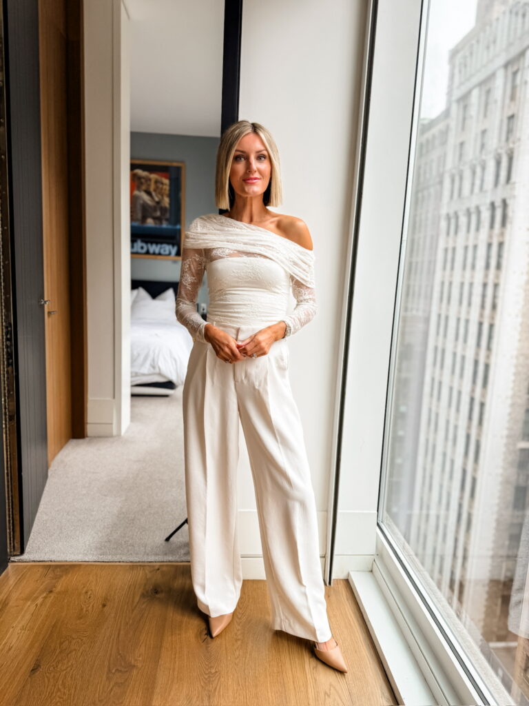 Nothing says timeless like a monochromatic all-white outfit! For a more elevated and professional look, I styled the lace top with classic pleated trousers, an essential closet staple. These trousers are effortlessly chic and work for so many occasions.