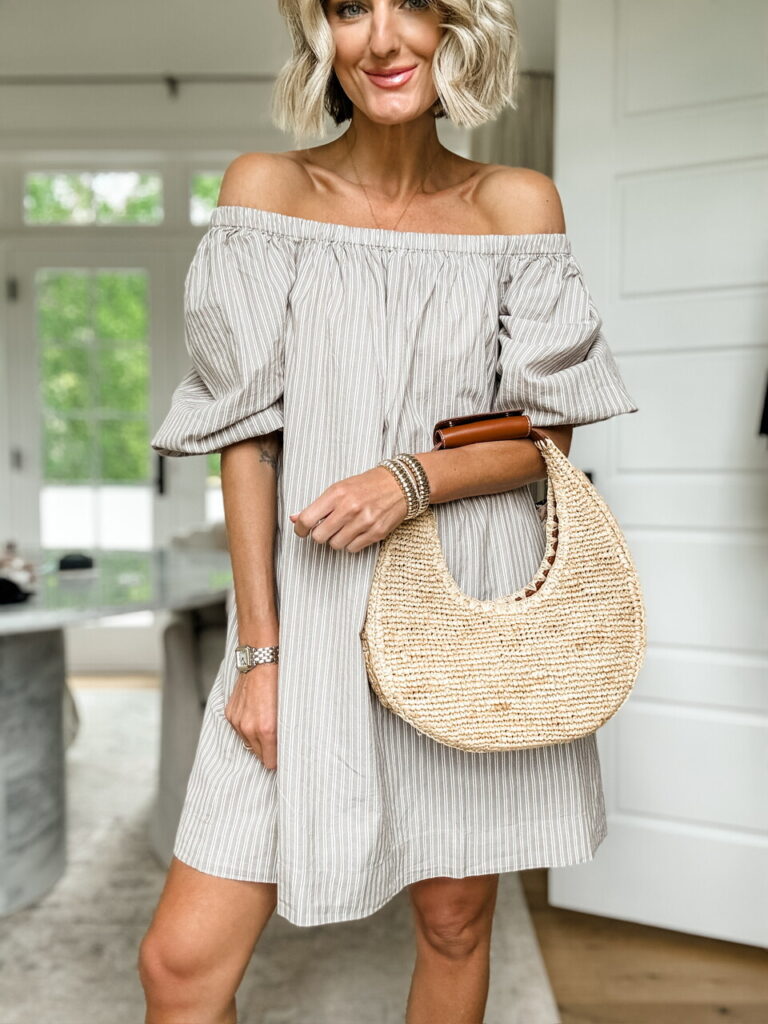 Embrace effortless elegance with this flowy off-the-shoulder striped dress. Perfect for beach days or brunch dates, this dress pairs beautifully with a straw bag for that quintessential summer look.