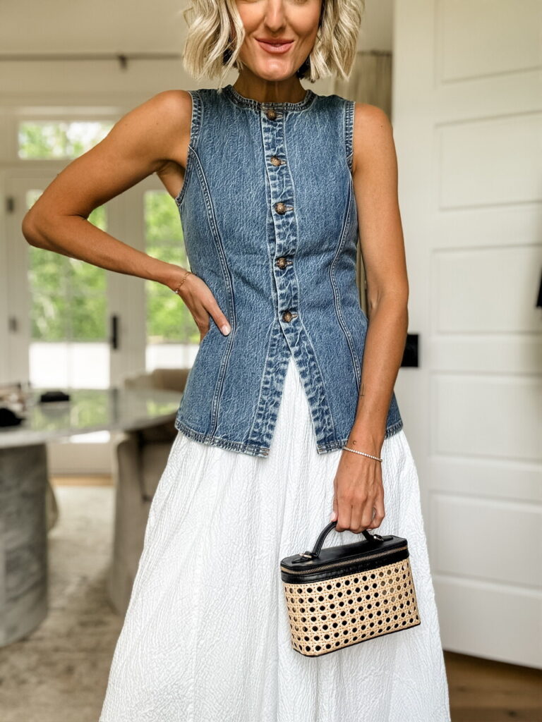 Embrace a laid-back, chic look with a white maxi skirt and denim vest. This outfit is ideal for strolling through farmers’ markets or enjoying outdoor festivals.