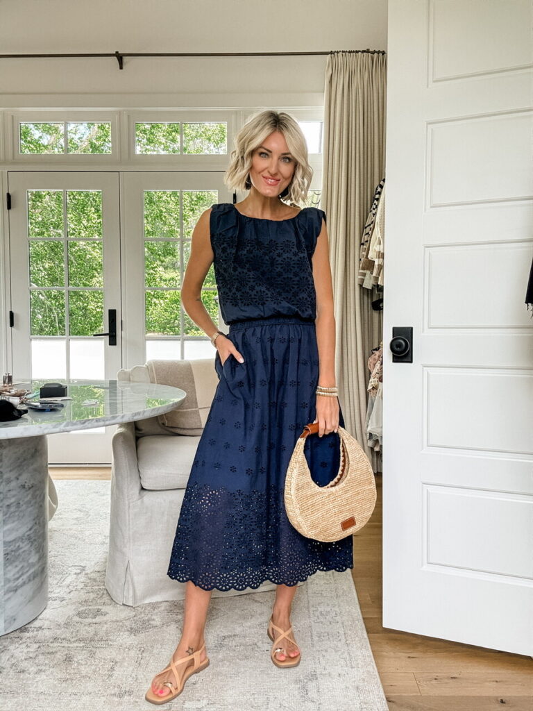There’s an effortless femininity to eyelet fabric that feels perfect for warm weather. This matching eyelet top and skirt creates a light and breezy ensemble that’s ideal for sun-soaked days.