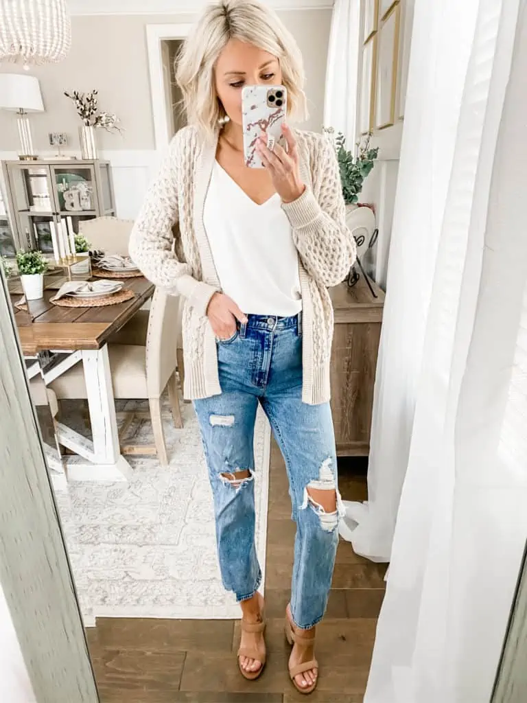 Target Cardigan \\ White Cami \\ Distressed Mom Jeans \\ Steve Madden Wedge Heels