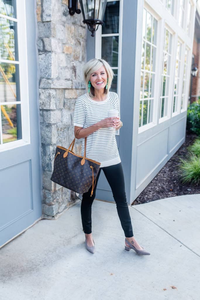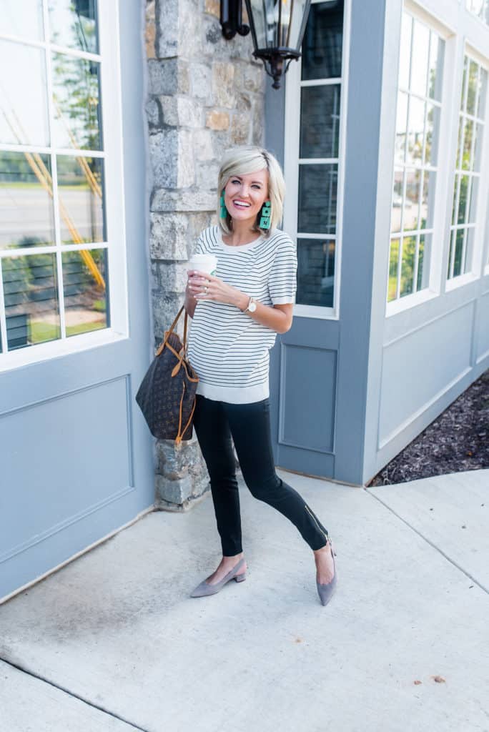 Today, I’m sharing a striped, short sleeve sweater that is great for work. This time of year can be tricky to dress for because the weather and trends are changing. The short sleeve sweater is perfect because it gives you warmth for the chilly mornings but also isn’t too stuffy or hot as the day warms up. I’m also a huge fan of stripes and tend to wear them whenever I can!